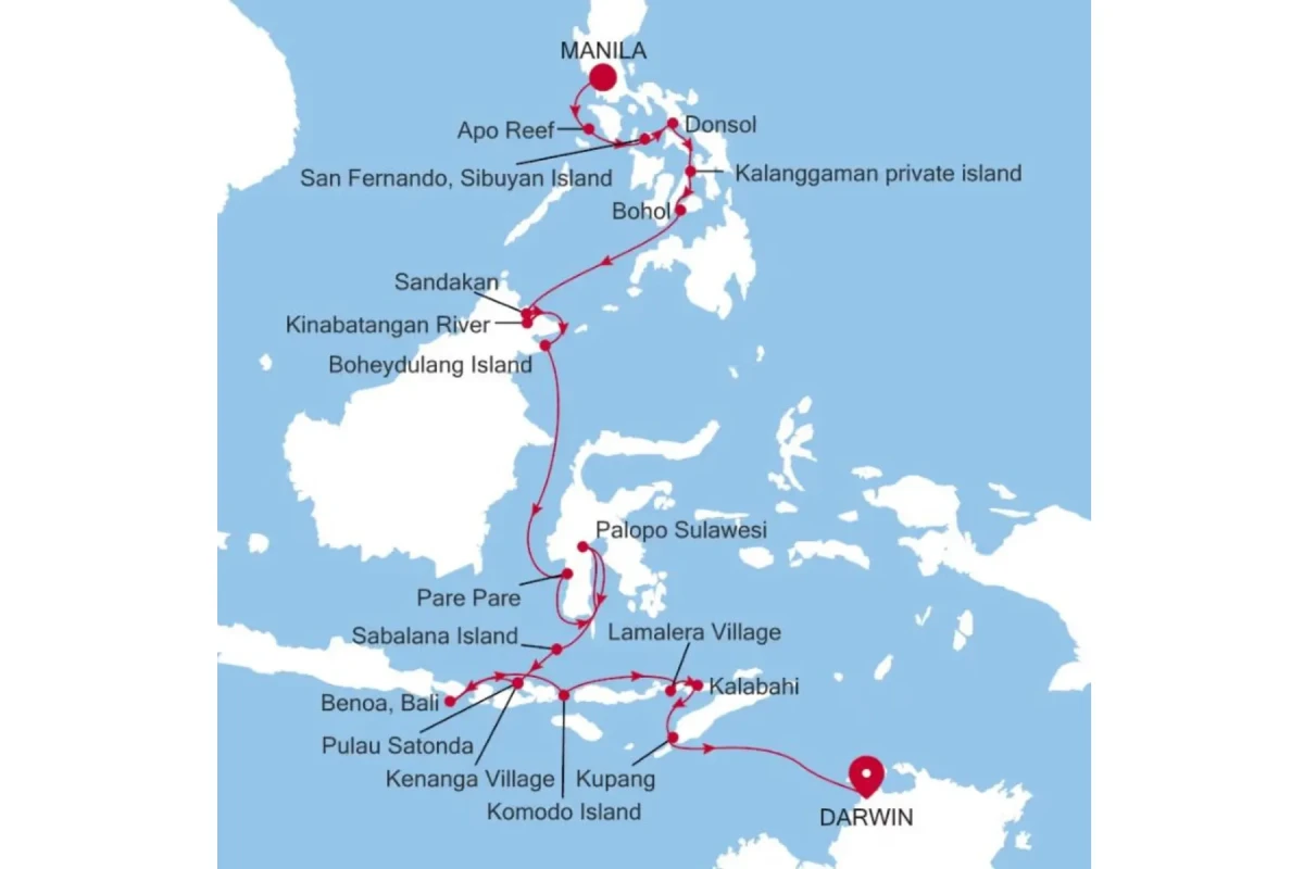 Beginning in Manila, cruise through the remote islands, snorkel the pristine waters of Apo Reef, Donsol, and unwind on the postcard-perfect shores of Kalanggaman private island. Cross into Borneo to explore the wildlife-rich Kinabatangan River, before venturing into the cultural heartland of Sulawesi and the ancient traditions of Tana Toraja, sun soaked Bali, then come face-to-face with the legendary Komodo dragon before crossing the open Timor Sea to arrive in Darwin, Australia. - Enjoy an exclusive USD$300 bonus onboard credit* per cabin