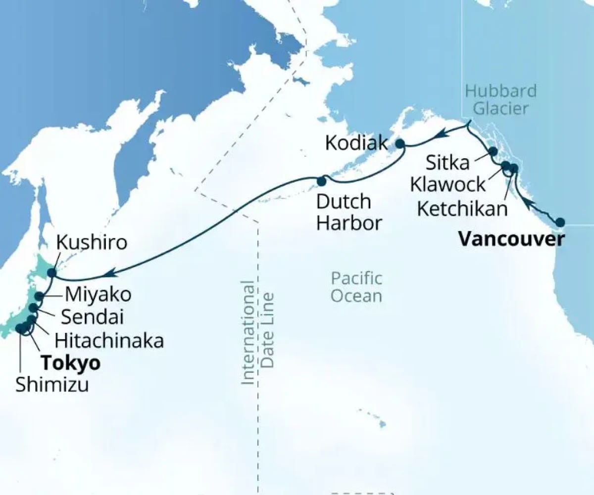 This immersive Vancouver to Tokyo cruise offers an unforgettable voyage across the Pacific, blending rugged Alaskan wilderness with the cultural beauty of Japan. Departing from Vancouver, the journey sails through scenic waterways including Seymour Narrows, Queen Charlotte Sound, and the majestic Hubbard Glacier. Explore charming Alaskan ports such as Ketchikan, Klawock, Sitka, Kodiak, and Dutch Harbour, each rich in wildlife and local heritage. After crossing the International Dateline, the adventure continues in Japan, visiting Kushiro, Miyako, Sendai, Hitachinaka, and Shimizu, before concluding in vibrant Tokyo - a perfect blend of natural wonders, cultural exploration, and ocean serenity.