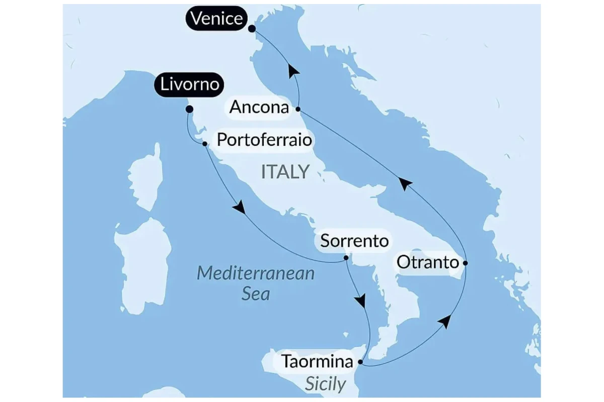 - Date: 08-18 September 2027, 10 nights Livorno to Venice