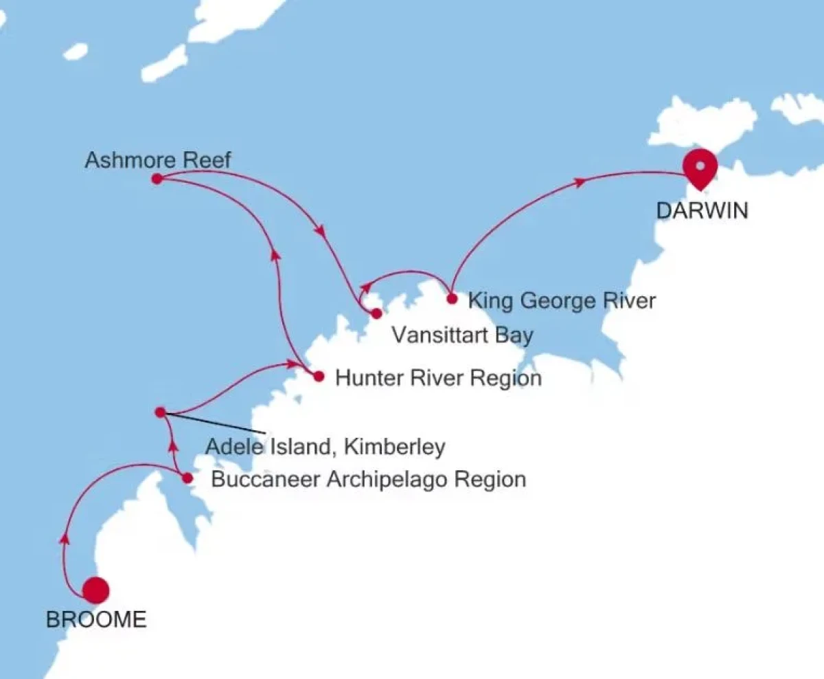 This luxury expedition cruise from Broome to Darwin journeys along the remote Kimberley coastline, featuring scenic cruising and landings in the Buccaneer Archipelago, Hunter River, Ashmore Reef and Vansittart Bay, and concludes with an overnight stay in Darwin after rich wilderness and cultural exploration. - - All onboard meals in complimentary dining venues