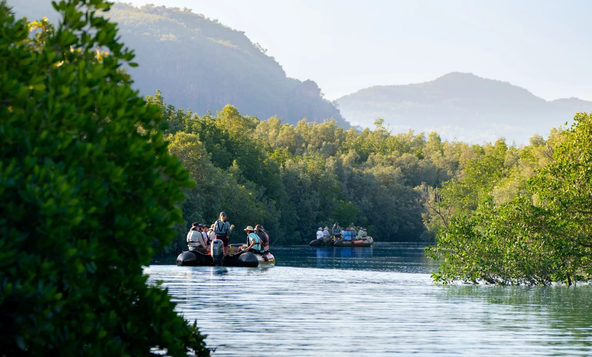 Where the Outback meets the ocean, the King George River offers one of the Kimberley's most striking and immersive experiences. Guests will board Zodiacs for an unforgettable journey through winding channels framed by towering red cliffs and ancient geological formations. This exclusive cruise offers a front-row seat to the raw, untamed beauty of the region, where saltwater crocodiles bask along the banks and Brahminy Kites soar overhead. It's not just a scenic ride - it's a voyage through deep time, rich in history and natural wonder, revealing the wild spirit of Australia's remote northwest.