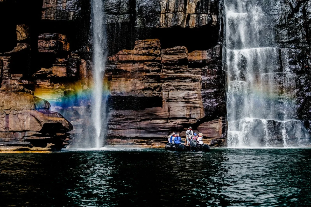 The journey up the King George River is nothing short of breathtaking. The 80-metre-high sides of the gorge display varying degrees of weathering of the ancient Warton sandstone. The colours and textures of the gorge change with the light as you travel further up the river creating a continual changing scenery that is simply stunning. The journey culminates at the King George twin falls; the highest single-drop falls in the whole of the Kimberley (80 m or 260 ft). Fed by wet season run-off the level of water cascading over the falls varies from year to year. Your Expedition Team will escort you in either the zodiacs or ships tenders to the foot of the twin falls, and explain all about the stunning geological formations of the canyon.