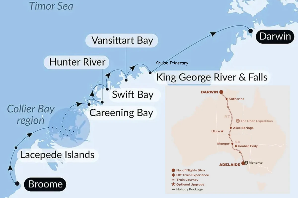 Embark on an unforgettable all-inclusive expedition through one of Australia's wildest and most pristine regions — the Kimberley Coast. Explore breathtaking natural wonders including the Lacepede Islands, home to abundant birdlife and sea turtles; the dramatic tidal spectacle of Montgomery Reef; the crocodile-inhabited mangroves of the Hunter River; and the remote beauty of Vansittart and Swift Bays. The highlight of the voyage is the awe-inspiring King George Falls, where towering cliffs, thundering cascades and ancient landscapes reveal one of the last truly unspoilt corners of Earth. Following your cruise, continue the all-inclusive adventure inland with three nights aboard The Ghan Expedition, travelling in a Gold Premium Cabin through Australia's vast outback. Enjoy immersive off-train experiences including the natural wonders of Nitmiluk Gorge, a spectacular dining experience at the historic Telegraph Station in Alice Springs, and time in the iconic opal-mining town of Coober Pedy. The journey concludes with two nights at Monarto Safari Resort, where luxury accommodation meets open-range wildlife encounters — an unforgettable finale surrounded by roaming animals and sweeping savannah views.