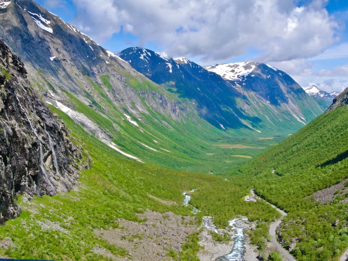 Not far from the idyllic Andalsnes, you–ll locate a unique curiosity: the –Troll Wall–, which features immense grassy cliffs forming Europe's highest vertical mountain face. An amazing natural wonder. A steady climb of the –Troll Ladder– entails a zigzagging road of hairpin bends on the steep mountainside, revealing spectacular valley views as you near the thundering Stigfossen Waterfall.