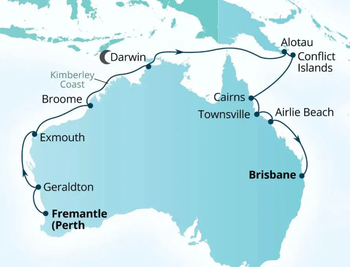 This enriching journey visits Geraldton, Exmouth, Broome, and Darwin along Western Australia's coast, cruises the remote Kimberley Coast, explores Papua New Guinea's Alotau and Conflict Islands, and continues through Cairns, Townsville, and Airlie Beach in tropical Queensland. - - All onboard meals including specialty restaurants