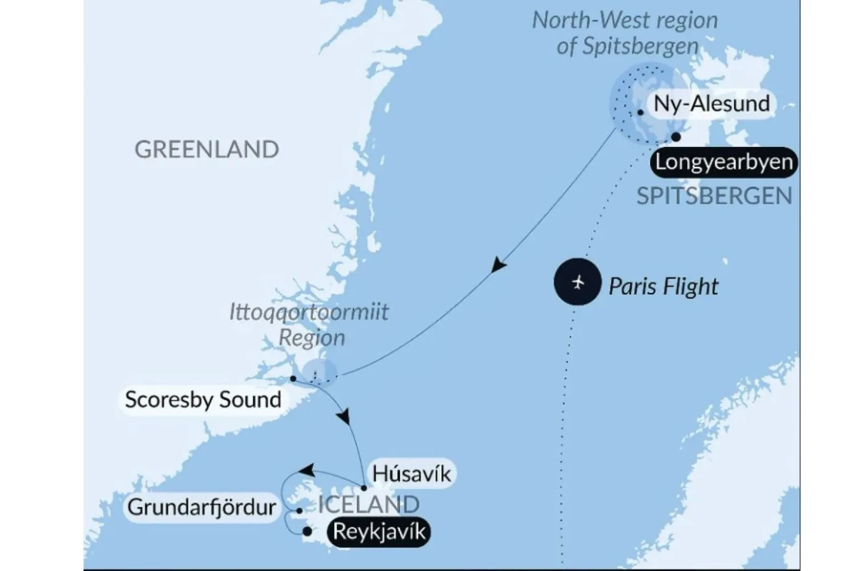 One-way economy flight from Paris to Longyearbyen - Date: 07-20 August 2027, 13 nights from Longyearbyen, Spitsbergen to Reykjavik, Iceland